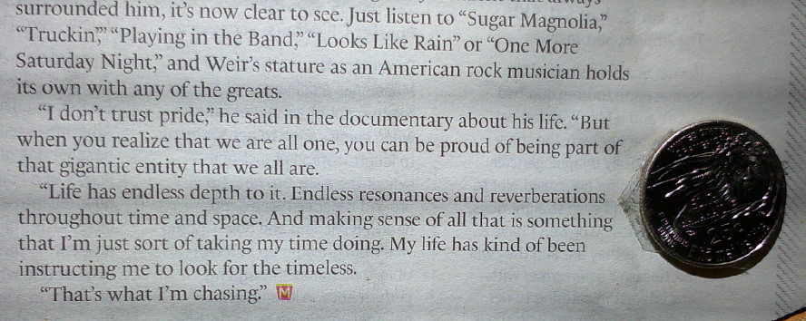 Jan. 16th, 2026: Partial page excerpt from Metro's centerfold memorial to Bob Weir of the Grateful Dead. The guy is timeless for sure now. I saw him live with the Grateful Dead, and then later on a date with Virginia. When they had the Dead & Co. 50th Anniversary at Levi's I ran the bike parking lot by the San Thomas Aquino Trail. At the time it was our biggest bike parking experience at the stadium by a lot. The quarter I found on the same walk I got the newsweekly in the picture.