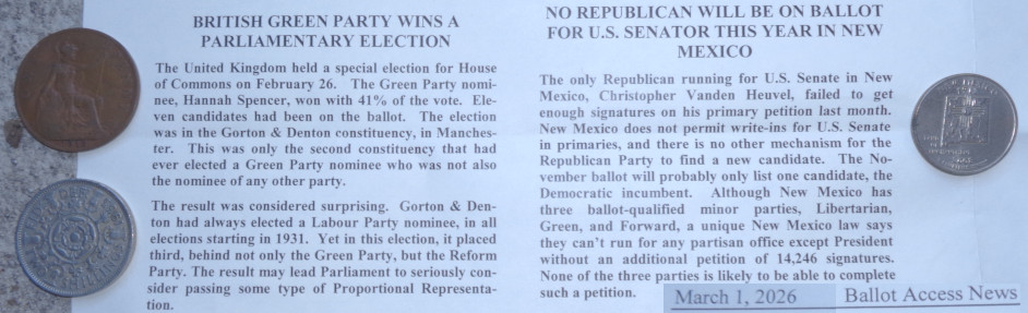 Mar. 2nd, 2026: Found these articles in the current issue of Ballot Access News on the way home from the mailbox. Looking for change to balance the political change with coin of the relm it dawned on me that it's been so long since I visited England that I don't have any of their current money in my collection.
