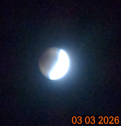 Mar. 3rd, 2026. Picture was taken about 3:03 AM on 3/3/2026. I was up late enough to catch the eclipse happening as shown here. Couldn't stay awake for the peak. Sorry about that. Takes a long time for the earth's shadow to cross the moon.