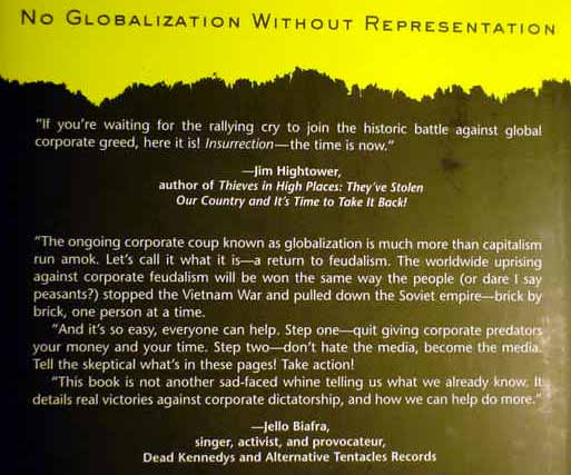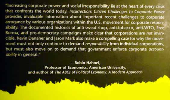 Insurrection is a book by Kevin Danaher and Jason Mark. In 315 breathless pages it covers the history of US Corporate accountability struggles and the more recent activist battles over sweatshops, dolphin safe tuna, tobacco, Burma, and rule making in the global economy. In every case the book discusses how the campaign looked to the consumer, the activist, and what the lingering impact of it is. Every chapter ends with at least a couple of pages of "lessons learned".