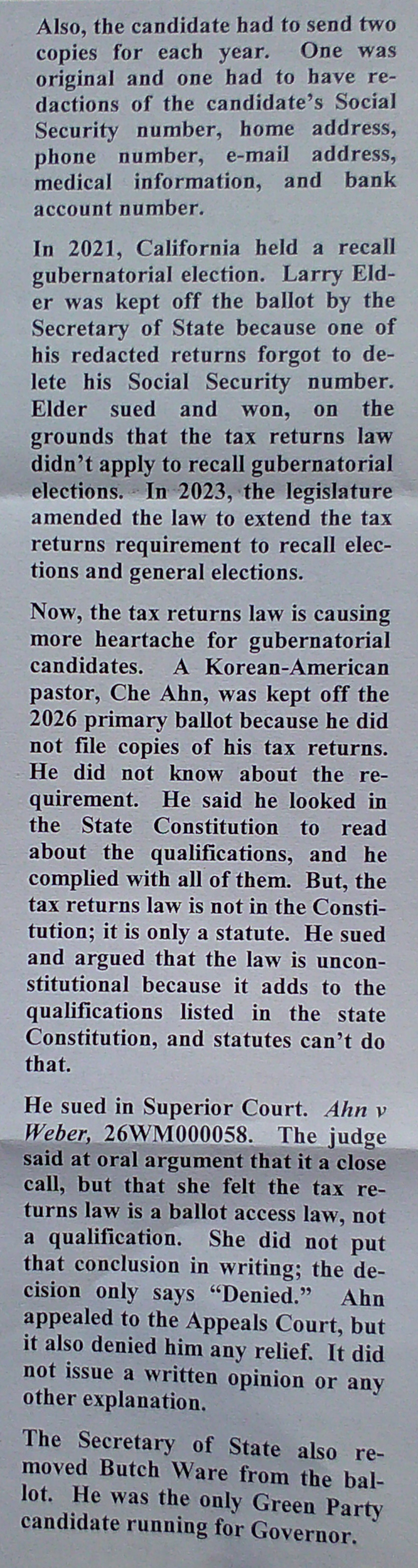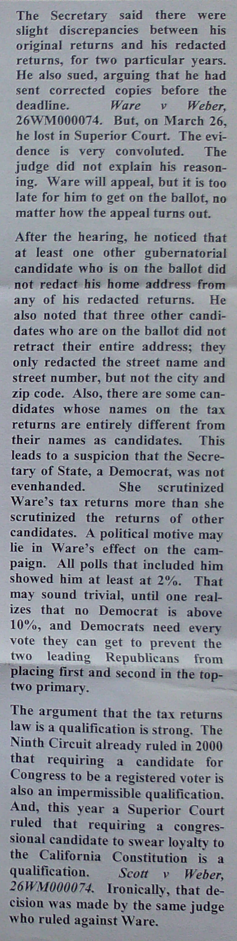 It does look like Butch Ware was singled out for harsher treatment when you consider what happened to the other candidates who made the same kind of mistake. Feeling like the system neutralized a threat in the most banal way possible.