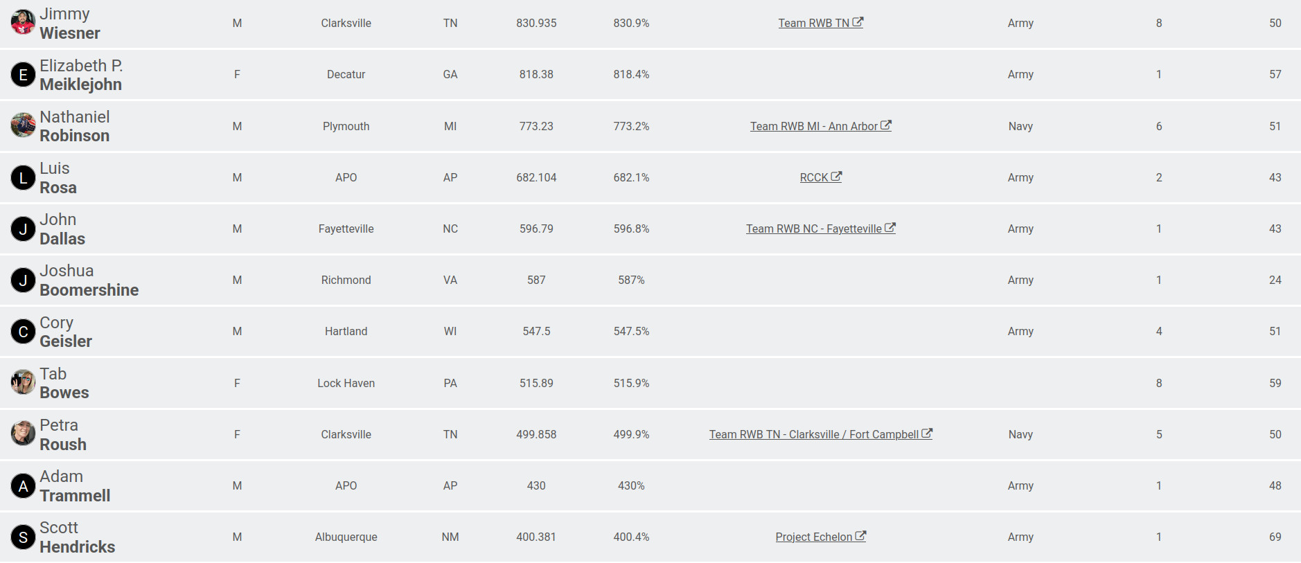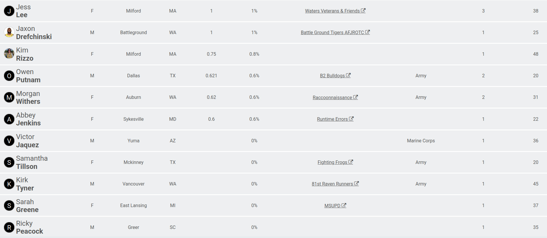 To get on the results chart for Taji-100 you had to enter some miles. That bottom is on page 182 of the results. Abbey Jenkins hasn't gone far, but at least she's done something.