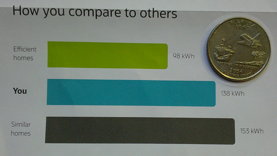 August 30th, 2025: The power summary is from today's mail. Even though I use less power than I did last year, the "Efficient homes" bar has been raised, so I'm no longer in the top category. Still use less power than the average bear in a similar home though. The quarter was recently used to buy a MEND YOUR FUELISH WAYS sticker from me. Picked that one to show because I like the jumble of old and new on it.