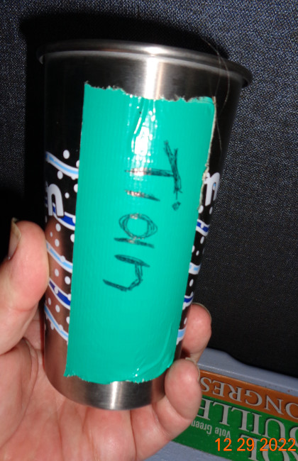 A lot of people tend to forget that I started this looking for a new way to do parties. Please bring a cup you're willing to use all evening and take home with you afterwards. If there is any possibility it can be confused with someone elses, please put your name on it. I've done that to the above one to illustrate the point.