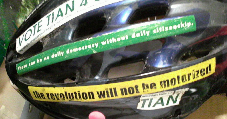 Somebody gave me that "the revolution will not be motorized" sticker at a San Francisco critical mass ride, back near the turn of the millennium.