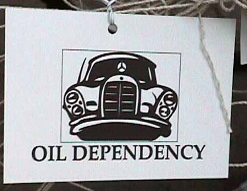 All of the cards hanging from the web on the back of this bicycle had pictures of cars and some sort of headline about their impact on us.