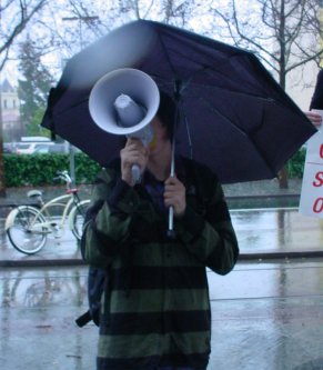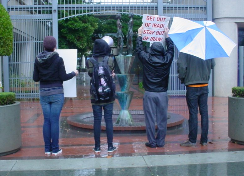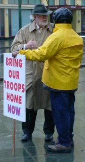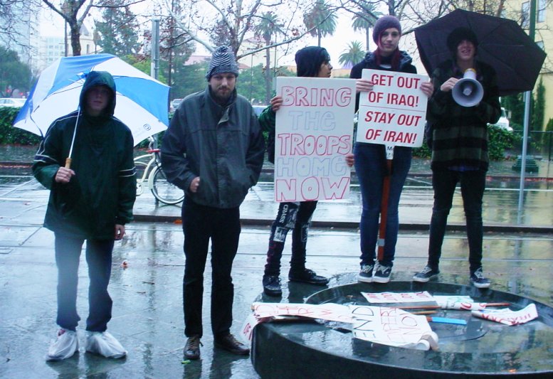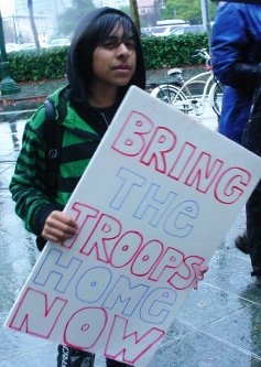 slogans like "Occupation is not Liberation" and "Troops Home NOW!" His