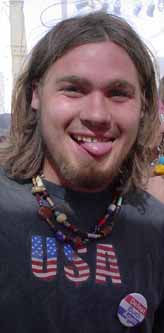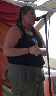 I went into Center Camp where they were doing open mike on one of the stages. The woman shown at left was baring her heart, and it was great. The guy in the "B" shirt was the host, and he let me have a minute to share my little speech with people. After that I went back to wandering the playa. The weather had cleared.